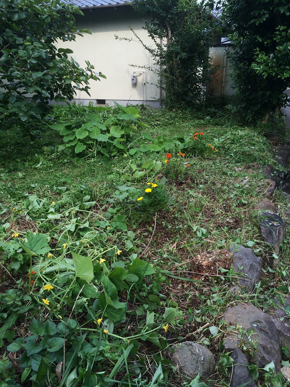 家内が植えてくれた花とキュウリが何とか見えるところまで