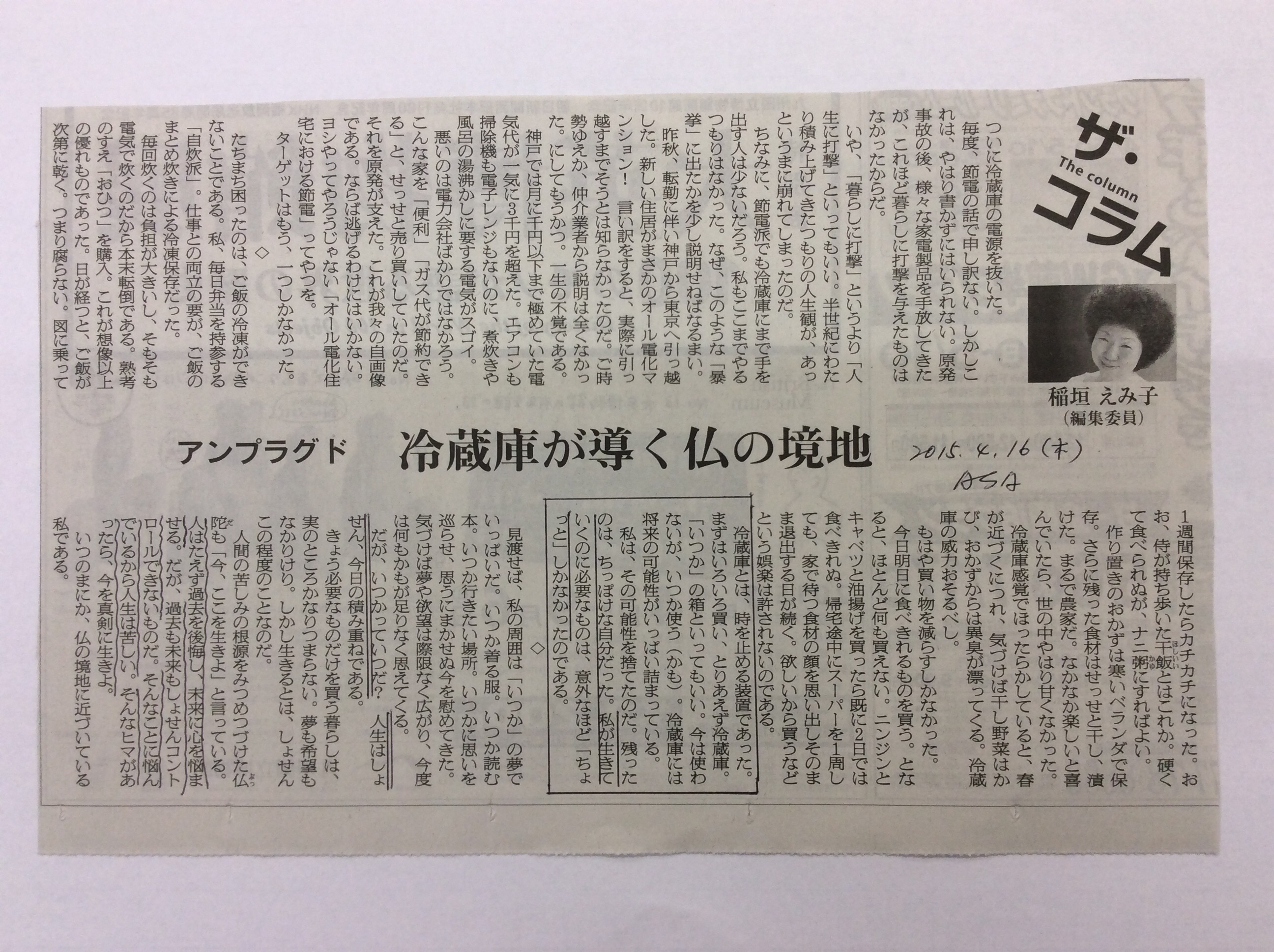 稲垣えみ子さんが書かれた「冷蔵庫が導く仏の境地」という一文です。